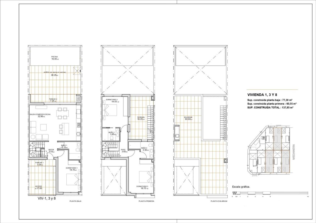 Nieuwbouwwoningen in San Javier – Modern design en bevoorrechte locatie Hedendaags design herenhuizen met prive zwembad Ontdek dit exclusieve complex van 9 gloednieuwe herenhuizen in San Javier, Murcia, ontworpen om maximaal comfort en een moderne levensstijl te bieden. Elke woning heeft een privézwembad, terras, solarium en parkeerplaats, en biedt zo een ideale ruimte voor ontspanning en plezier het hele jaar door. De woningen zijn gebouwd met hoogwaardige materialen en een open ontwerp dat optimaal gebruik maakt van natuurlijk licht. Ze zijn perfect voor zowel een permanente verblijfplaats als een vakantiehuis aan de Costa Cálida. Distributie en uitrusting van hoge kwaliteit Elk herenhuis heeft: 3 ruime slaapkamers met inbouwkasten en ladekast. 3 volledig ingerichte badkamers met meubels, spiegels en schermen. Open keuken, volledig ingericht en inclusief witgoed. Ruime woon-eetkamer, met grote ramen die aansluiten op het terras. Privézwembad met douche en tuin met kunstgras. Solarium met zomerkeuken, perfect om te genieten van het mediterrane klimaat. Pre-installatie van airconditioning op elke verdieping. PVC buitenschrijnwerk met dubbele beglazing, waardoor thermische en akoestische isolatie gegarandeerd is. Beveiligde toegangsdeur, voor meer gemoedsrust en bescherming. Strategische ligging in San Javier San Javier is een kustplaats met een breed scala aan diensten, sportfaciliteiten en recreatiegebieden. De locatie van deze woonwijk biedt snelle toegang tot: Stranden van de Mar Menor – Slechts 5 minuten met de auto. Stranden van de Middellandse Zee – Op 10 minuten afstand. Golfbanen – Verschillende mogelijkheden in de omgeving, ideaal voor golfliefhebbers. Winkelcentra en diensten – Alles wat je nodig hebt op slechts een paar minuten afstand. Luchthaven Murcia-Corvera – 30 minuten rijden. Vliegveld Alicante – 45 minuten rijden. Geniet van het beste klimaat en de beste levenskwaliteit in San Javier San Javier is een uitstekende optie voor wie op zoek is naar een woning dicht bij zee, met een bevoorrecht klimaat en toegang tot allerlei buitenactiviteiten. Mis de kans niet om een van deze exclusieve woningen te kopen. Neem vandaag nog contact met ons op voor meer informatie of om een bezichtiging te plannen.
