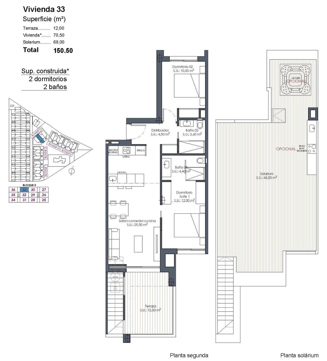 Nieuwbouw resortappartementen bij La Serena Golf-Los Alcazares vlakbij het strand Modern wonen aan de golfbaan aan de Costa Calida Ontdek dit exclusieve nieuwbouwresort bij La Serena Golf in Los Alcazares. Dit moderne project bestaat uit 66 stijlvolle appartementen met 2 of 3 slaapkamers en 2 badkamers, waarvan één en suite, ontworpen om comfort, elegantie en een uitzonderlijke mediterrane levensstijl te bieden op slechts 300 meter van de Mar Menor. Los Alcazares is een charmant kustplaatsje dat bekend staat om zijn ontspannen sfeer, zandstranden en lange boulevard. Met meer dan 300 dagen zon per jaar biedt de omgeving een perfecte omgeving voor buitenactiviteiten, watersporten en golf. Het stadje biedt ook een ruime keuze aan restaurants, winkels, jachthavens en sportfaciliteiten, waardoor het een zeer gewilde bestemming is voor zowel permanente woningen als vakantiehuizen. Appartementen met terrassen, tuinen en privésolaria Het wooncomplex biedt verschillende soorten woningen die passen bij verschillende levensstijlen. Kopers kunnen kiezen tussen appartementen op de begane grond met privétuinen, woningen op de middelste verdieping met ruime terrassen of penthouses met terrassen en grote solaria op het dak. De solariums zijn voorzien van een buitendouche en bieden de mogelijkheid om een zomerkeuken en een privéjacuzzi toe te voegen, waardoor een ideale ruimte ontstaat om te ontspannen en te entertainen terwijl u geniet van het open uitzicht op de golfbaan en het omringende landschap. Elke woning is ontworpen met een licht interieur en open leefruimtes die naadloos aansluiten op de buitenruimtes. Resortachtige voorzieningen en uitzonderlijke gemeenschappelijke ruimtes Een van de meest onderscheidende kenmerken van dit project is het resortachtige concept. Bewoners kunnen genieten van een spectaculair lagunezwembad van ongeveer 190 m2 met strandtoegang en ontspanningsruimtes met Balinese bedden. Extra gemeenschappelijke voorzieningen zijn onder meer aangelegde tuinen, een spa, een fitnessruimte en een sauna in de kelder. Het complex biedt ook een kinderspeelplaats, twee petanquebanen en gemeenschappelijke toiletten bij het zwembad, waardoor een gastvrije omgeving voor bewoners en gasten wordt gecreëerd. Hoogwaardige afwerking en moderne voorzieningen De appartementen zijn gebouwd met moderne materialen en hoogwaardige specificaties, ontworpen voor comfort en stijl. Volledig uitgeruste keuken met witglanzende apparatuur Badkamers met wastafels, doucheschermen en verlichte spiegels Gemotoriseerde rolluiken Basisverlichtingspakket Volledig geïnstalleerde airconditioning Ondergrondse parkeerplaats voor elke woning Ondergrondse fietsenstalling en optionele opslagruimtes Toplocatie dicht bij het strand en de golfbaan Mar Menor-strand 0,3 km La Serena Golf naast het project Centrum van Los Alcazares 2 km Cartagena 22 km Murcia 40 km Internationale luchthaven van Murcia 30 km Luchthaven Alicante Elche 90 km Het rustige en ondiepe water van de Mar Menor is het hele jaar door ideaal om te zwemmen, zeilen en paddleboarden. Verzeker uzelf van een woning in La Serena Golf Resort Deze moderne appartementen combineren wonen aan het strand, uitzicht op de golfbaan vanuit de meeste woningen en resortachtige voorzieningen in een van de meest aantrekkelijke gebieden van de Costa Calida. Neem vandaag nog contact met ons op voor meer informatie of om een bezichtiging te regelen en verzeker uzelf van uw nieuwe woning in La Serena Golf-Los Alcazares.