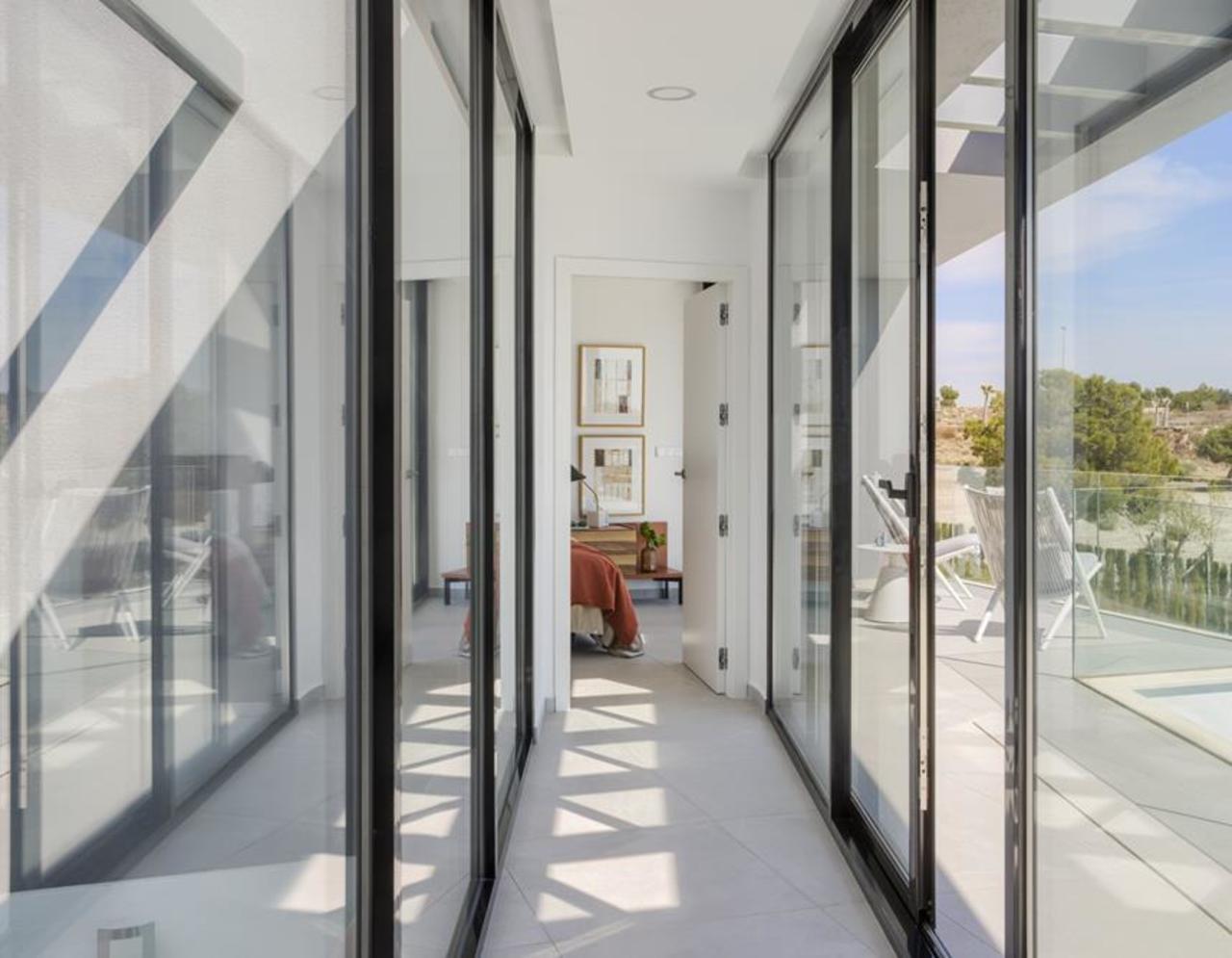 Een elegante loopbrug leidt naar de bovenverdieping, waar de slaapkamers uitzicht hebben op de groene tuin en het omliggende landschap.