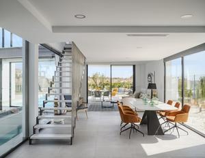 Grote schuiframen verbinden de binnenruimtes met de terrassen en de tuin, waardoor het binnen- en buitenleven naadloos in elkaar overgaan.